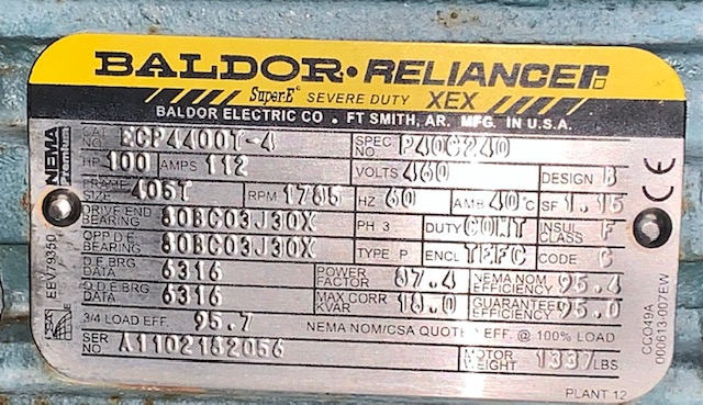Baldor Reliance AC Motor Super E Severe Duty, 100hp, 1785rpm, 460v, 405T, 112Amps, 1337Lbs