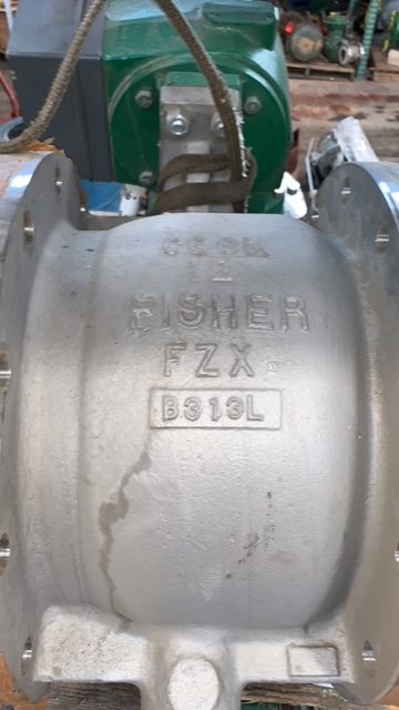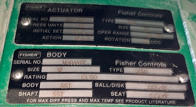 New Storeroom Spare Fisher 12″ V150 with pneumatic actuator and positioner; material CG8M Stainless Steel.