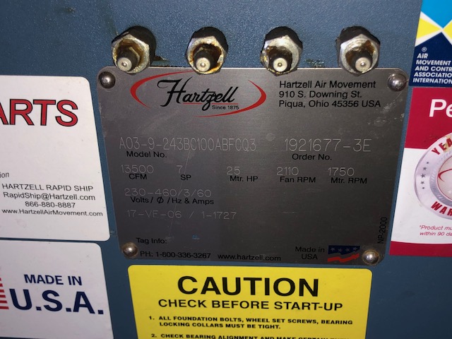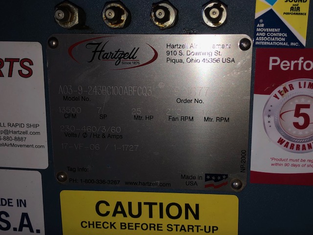 New Storeroom Spare Hartzell Blower 13,500 CFM