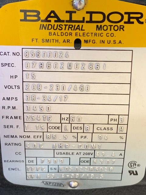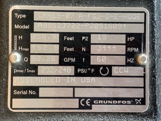 New Storeroom Spare 15hp Grundfos pump, 359.9 feet, 90.26 gpm, 3444 rpm