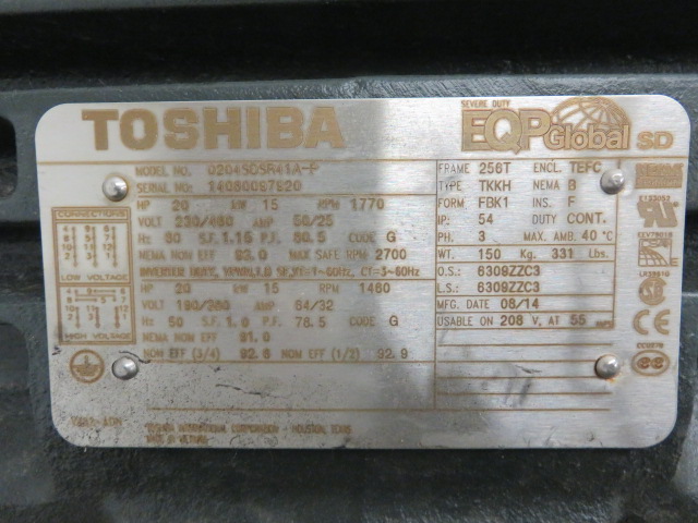 New Surplus Toshiba 20hp, 1770rpm, 460v, frame 256T, type TKKH, ENCL TEFC, DUTY CONT