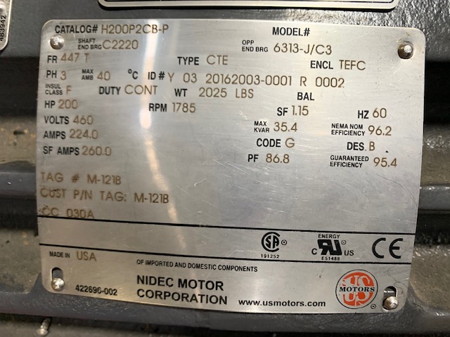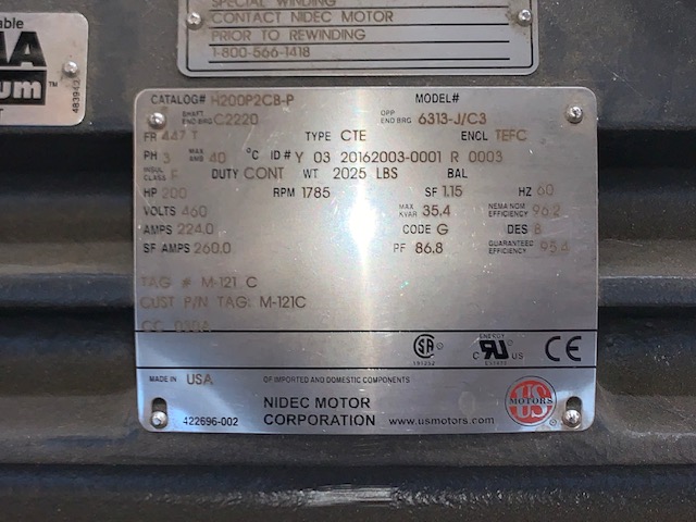 Unused Condition US MOTORS AC Motor 200hp, 1785rpm, 460v, 447T, TEFC