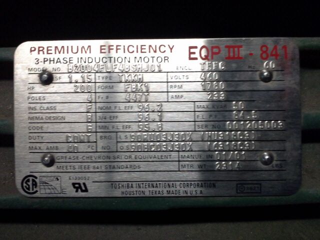 Toshiba Electric Motors – AC Motor 200hp, 1780rpm, 460v, type TKKH, form FBK1, frame 447T, new condition