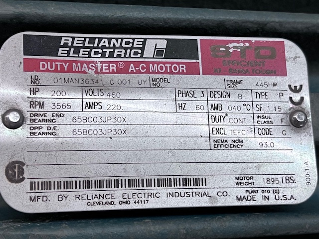 Description: Manufacture: Reliance Electric Hp: 75 Rpm: 1185 Volts: 460 Frame: 405T200 hp Allis Chalmers AC motor, 1180 rpm