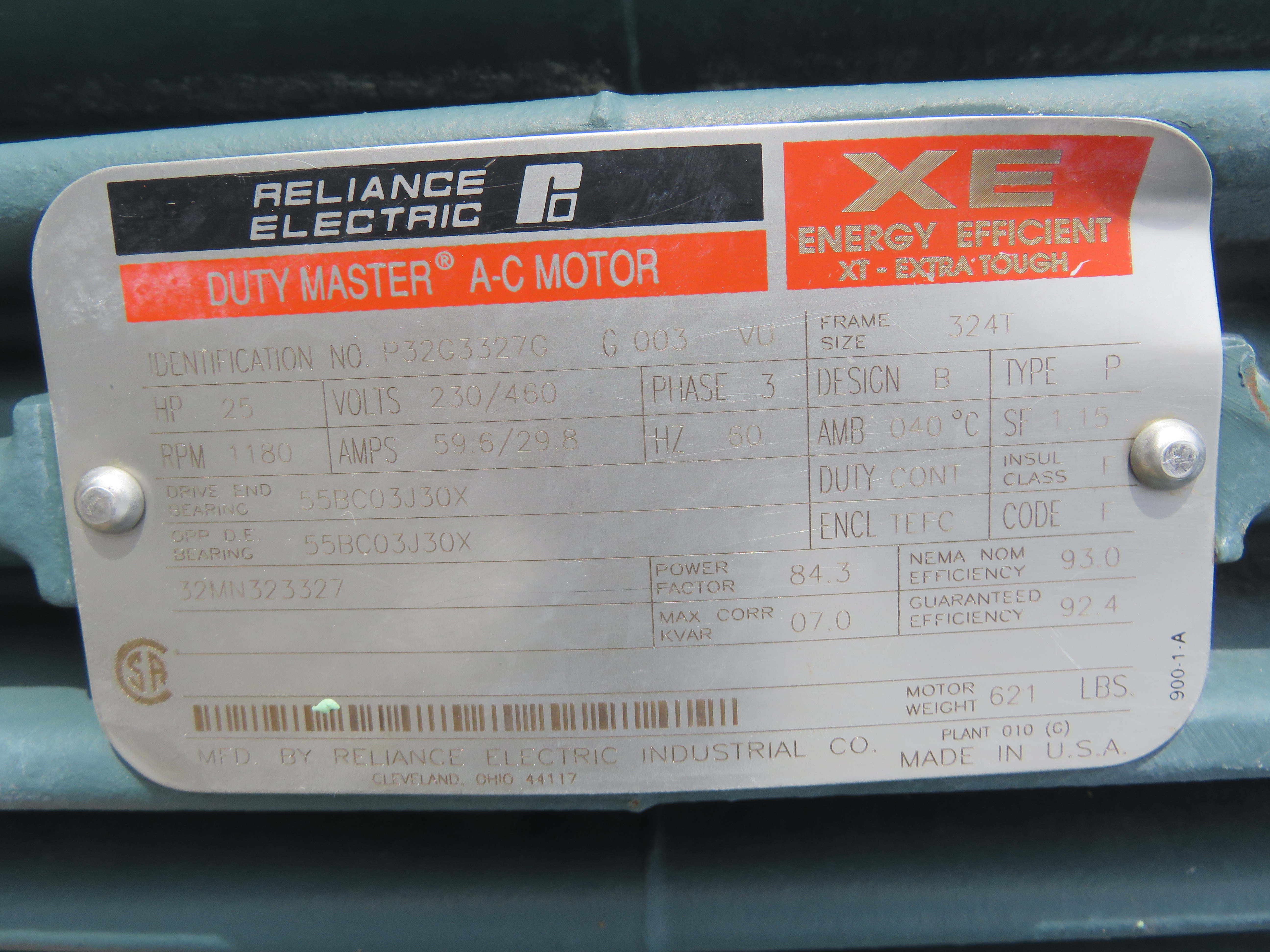 Reliance Electric AC motor, 25hp, 1180rpm, 460v, frame 324T, 59.6 Amps