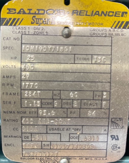 Baldor Super E 25hp, 1770rpm, 460v, 284T AC Motor