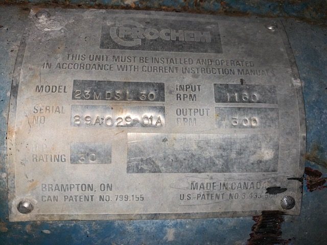 30hp Prochem side mount agitator mixer, stainless steel material. Suggested Motor: 30hp, 1175rpm, 460v, 326T, TEFC.
