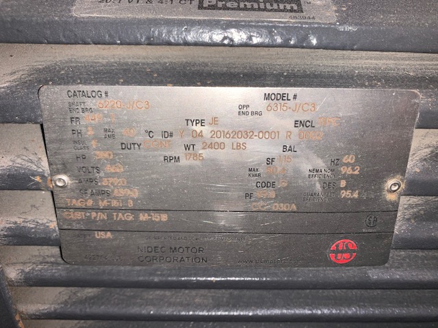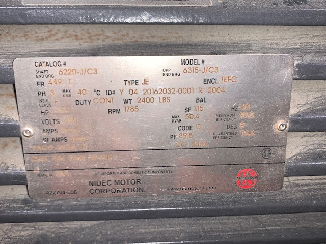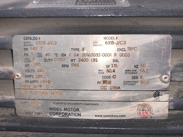 Unused Condition US Motors AC Motor 350hp, 1785rpm, 460v, 449T, TEFC