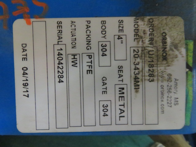 Unused Condition Orbinox 4″-150# knifegate valve hand wheel operated; order u/18283, model 203434MI, seat METAL, body 304, gate 304, packing PTFE, serial 14042284, date 04/19/17