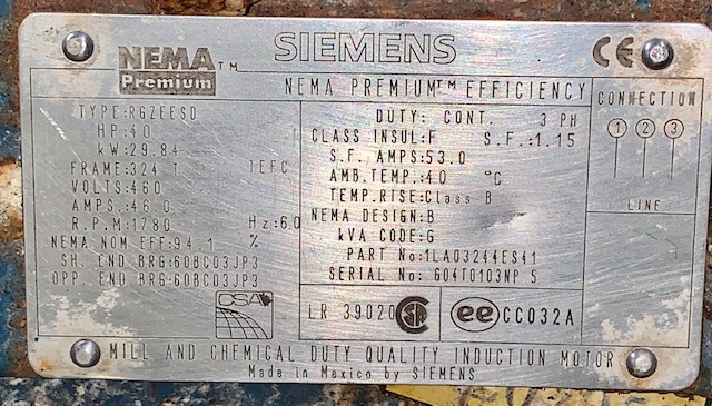 Siemens 40hp, 1780rpm, 460v, frame 324T, 46.0 Amps AC Motor