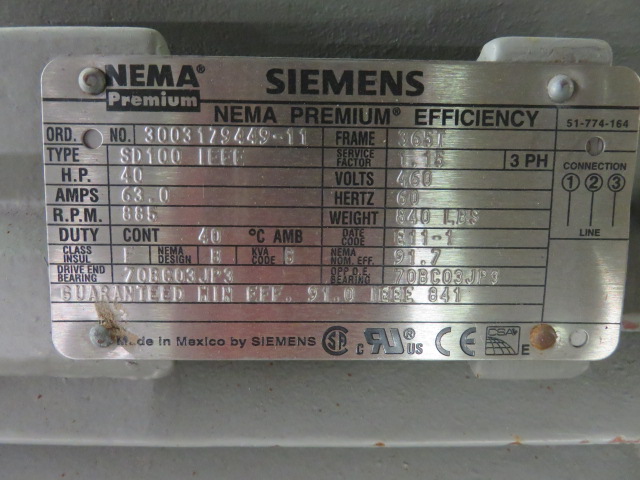 Unused Condition Siemens 40hp, 885rpm, 460v, frame 365T, 63Amps
