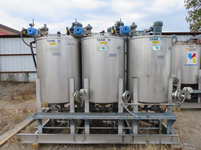 Used-Mason Steel Tank, Approximately 2,500 Gallons, Stainless Steel, Vertical. Approximate 96″ diameter x 74″ straight side, dished top & bottom. Internal rated 14.9 psi at ambient temperature. Off center top entering Lightnin agitator, model 73-C-5, serial# 79073421, ratio 31.3, output rpm 56. Approximate 2-1/2″ diameter shaft with a 4 blade turbine, driven by a 5hp, 3/60/230/460 volt, 1740 rpm motor. (3) 48″ Tall side wall baffles. Openings top 1-1/2″, 2″, 4″, 10″ 18″ man way with cover, 3″ center bottom outlet. Mounts on carbon steel side lugs. Serial# T-4483-9A, built 1980.