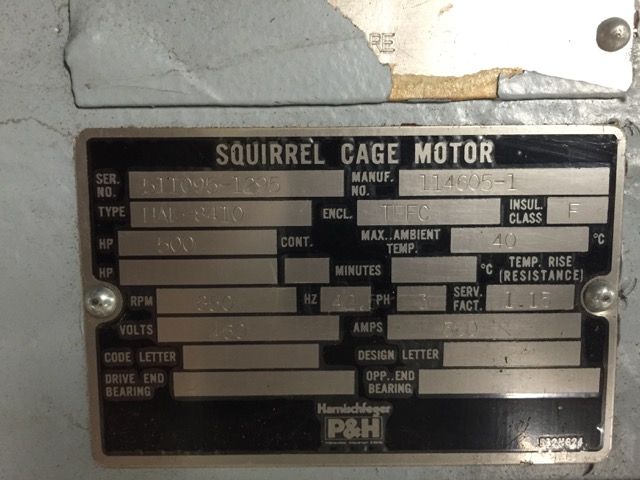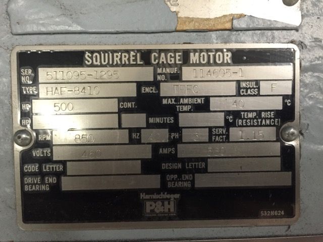 New P&H Squirrel Cage Motor 500hp, 850rpm, 460v, type HAF-8410, 42.5Hz, 3 phase, 560 Amps
