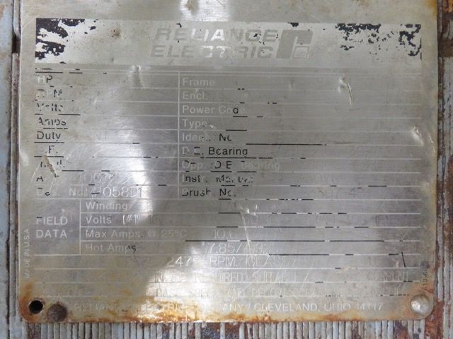Reliance Electric D-C- Motor, 500hp, 1150/1400rpm, 500v, 791 Amps, SF 1.15, frame B589ATZ, Encl. 8PG-SV, type TR, Power Code C