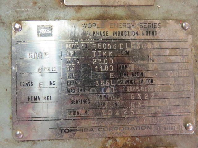 500 hp Toshiba WorldEnergy Series Induction Motor, 2300v, 1180 rpm, model F500 6 DLF 3 GOP, type TIKK, frame 355L, 6 poles