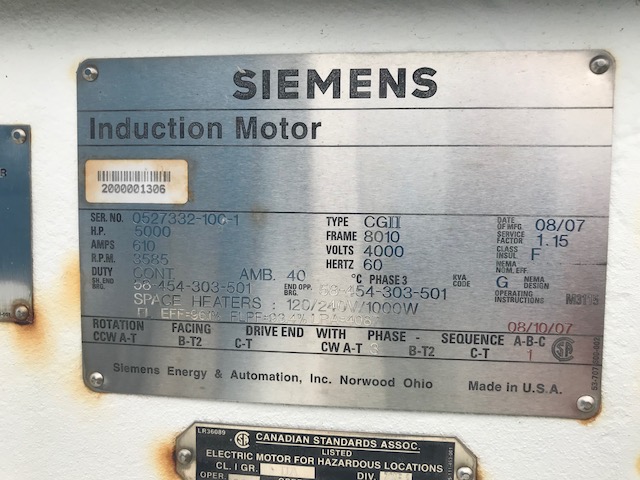 Siemens Induction AC motor 5000 hp, 610 amps, 3585 rpm, Duty CONT, type CGII, frame 8010, volts 4000, hertz 60, Date of Manufacture 08/07, Service Factor 1.15, Class Insul. F, Made in U.S.A. Weights aprox 18,500 lbs
