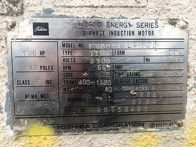 Toshiba 700hp, 2300v, 592rpm, 184 amps, AC Induction Motor