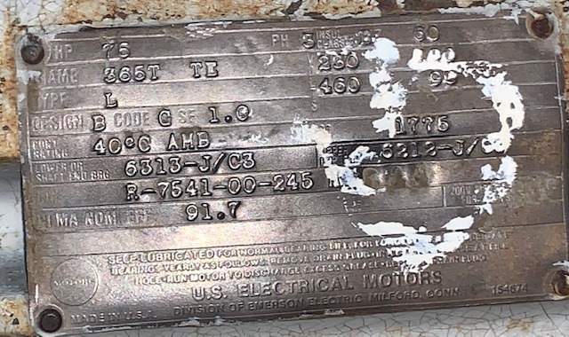 US Electrical 75hp AC Motor, 1775rpm, 460v, frame 365T, TE