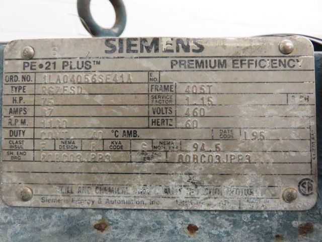 Siemens PE-21 Plus Induction AC motor, 75hp, 1180rpm, 460v, frame 405T
