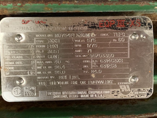 Toshiba 75hp, 1779rpm, 575v, 365T, TEFC AC Motor, used in good working condition!