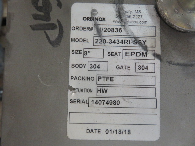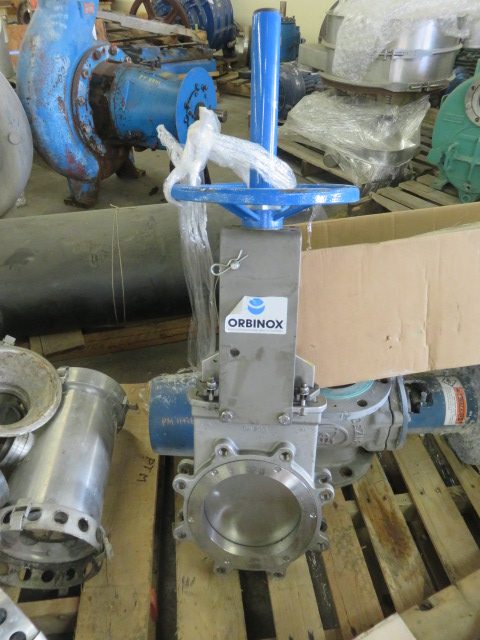 Unused Condition Orbinox 8″-150# knifegate valve hand wheel operated; seat EPDM, body 304, gate 304, packing PTFE, date 01/18/18