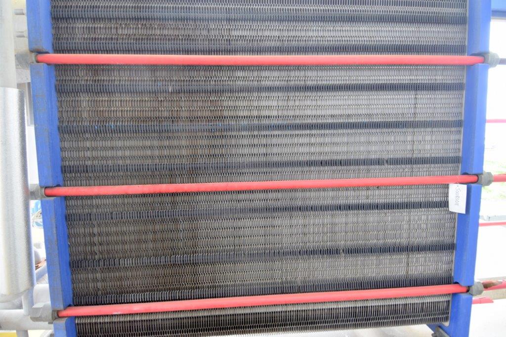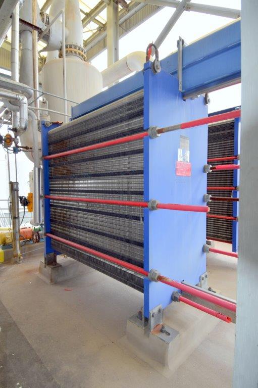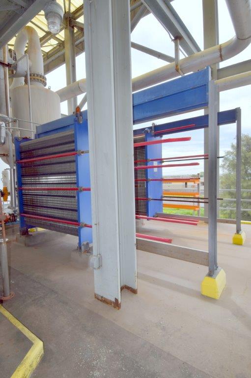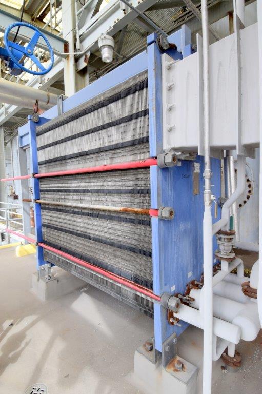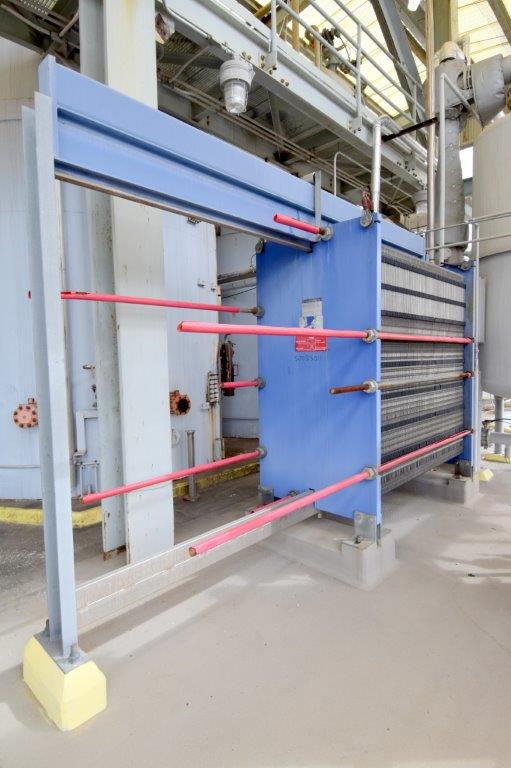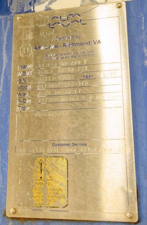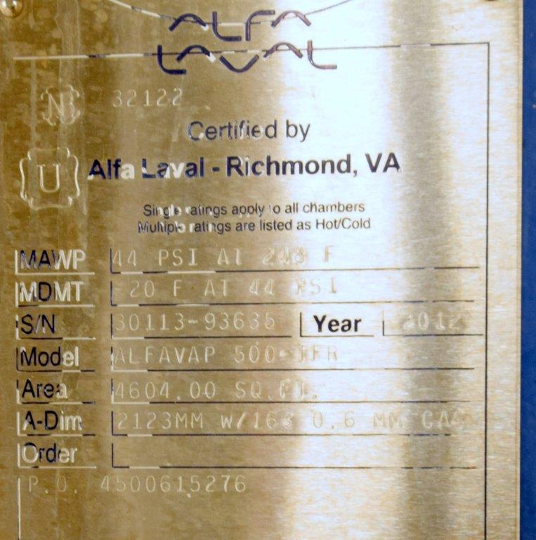 Used- Alfa Laval AlfaVap Plate Exchanger, 4,604 Square Feet, Model AlfaVap 500-TFR. (163) Sets of approximate 39″ wide x 80″ tall 316 stainless steel plates. Designed 44 psi at -20 to 248 degrees F. product inlet & outlets, steam inlet, condensate outlets. Mounted on a carbon steel expandable frame. Serial# 30113-93635, National Board# 32122, built 2012.
