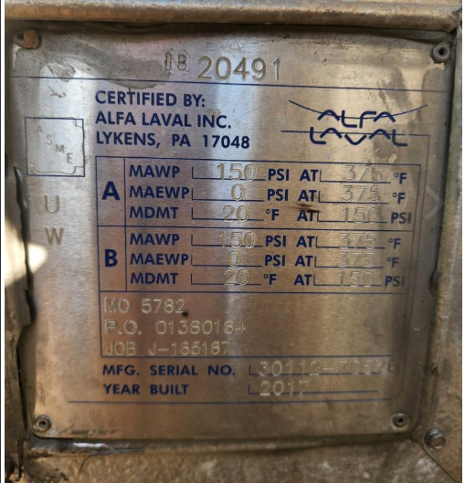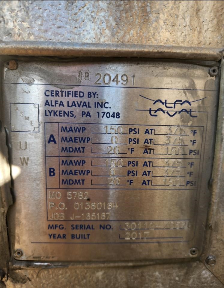 Used- Alfa Laval Spiral Heat Exchanger, Model 1H-L-1T, 3,000 Square Foot, 304L Stainless Steel. Inner channel rated 150 psi at 20 to 375 degrees F. Outer channel rated 150 psi at 20 to 375 degrees F. Channel spacing “. Unit width 72″. Openings: (4) 6″, (4) 1”. Inertex SQS gaskets. Davit Arms. Mounted on legs. National Board# 20491, Serial# 30112-70576, Built 2017. Approximately 27,000 lbs, 97″ long x 84″ x 93″ tall.