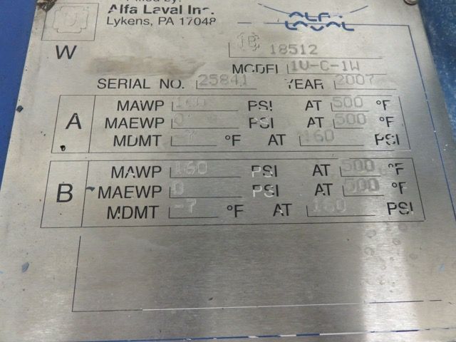 Description: Manufacture: Alfa Laval 100 psi @ 350F 2005Alfa Laval Plate Heat Exchanger model MA30-SFM