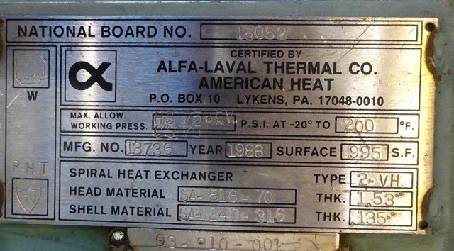 Alfa Laval Spiral Heat Exchanger type 2-VH, year 1988, head material SA-516-70; shell material SA-240-316; 75 psi @ 200F