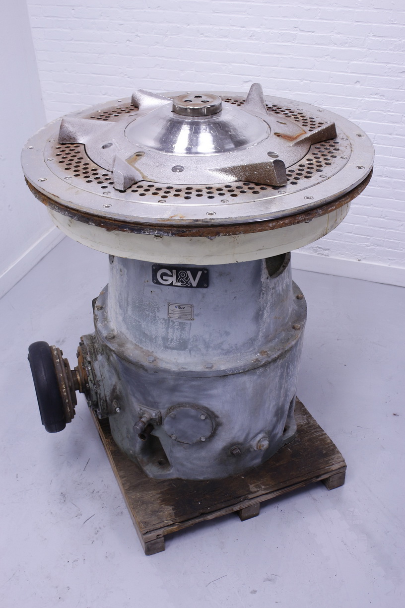Gl&V 350v Pulper Drive, With Stainless Steel Extraction Plate, With Stainless Steel 6-Vane Rotor, Ratio Approx 3.52/1, 43″ Diameter Rotor Casting # D54 307003, 48″ Diameter Extraction Plate, 7/8″ Diameter Holes, With Extraction Chamber