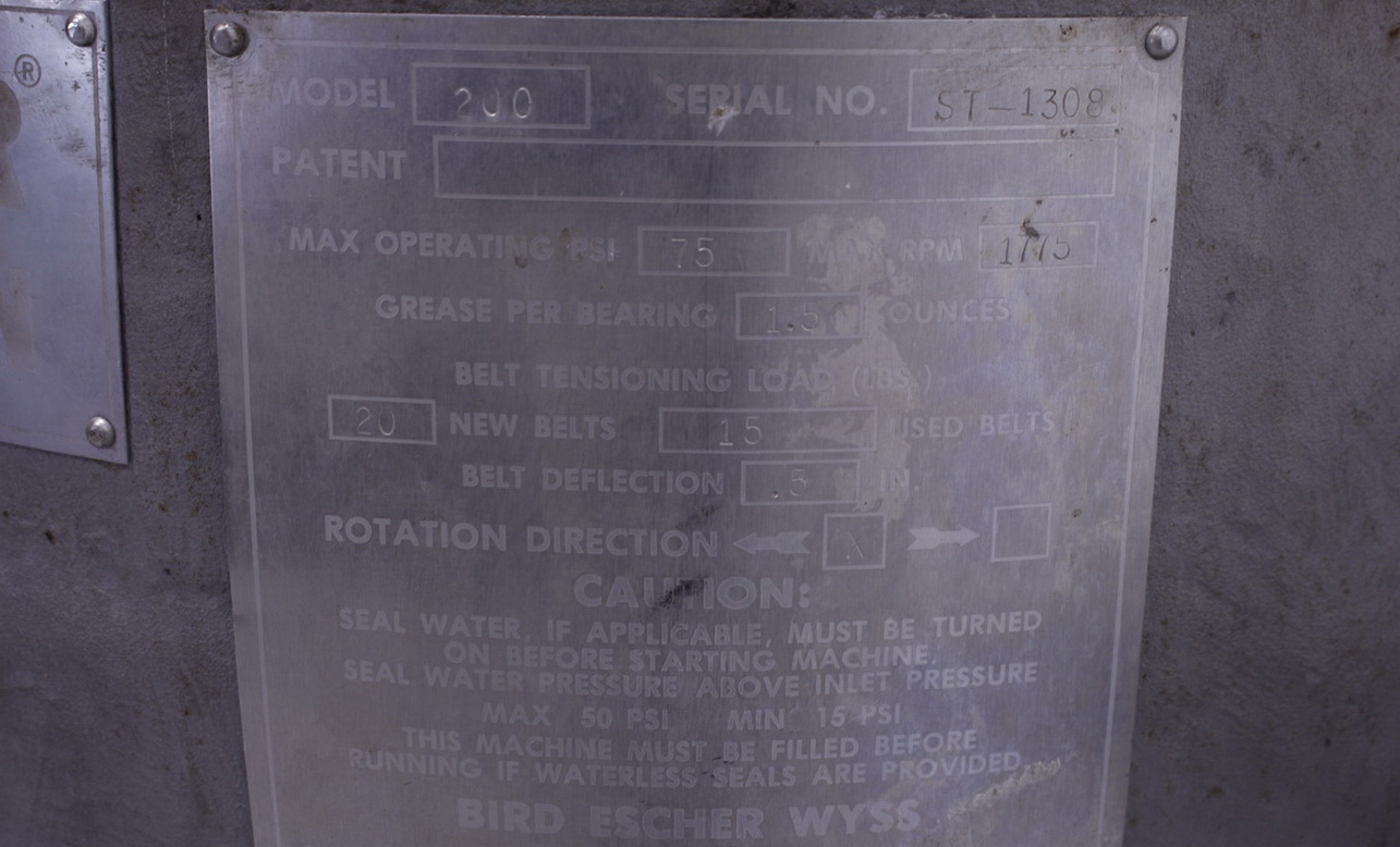 Bird 200 Pressure Screen, Stainless Steel Casing, Stainless Steel Lobe Rotor Casting # Vc5403, Serial # 272-005, Stainless Steel Basket, Holes .062″, Casting # D5351-1 Xst-2, With Base,