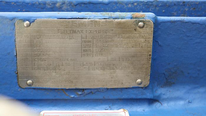 Bird 400 Pressure Screen, Stainless Steel Housing, Stainless Steel Solid Rotor, Stainless Steel Basket With .010″ (.25 mm) Slots, Max Operating Pressure 75 Psi, Max Rpm 1300, With Reliance AC Motor, 125 Hp, 1780 Rpm, 444T Frame, 460 Volts
