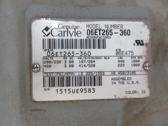 Unused Condition Carlyle semi-hermetic compressor model 06ET265-360, weight aprx. 566 lbs, voltage 208/230/400/460 VAC, locked rotor amps 446,