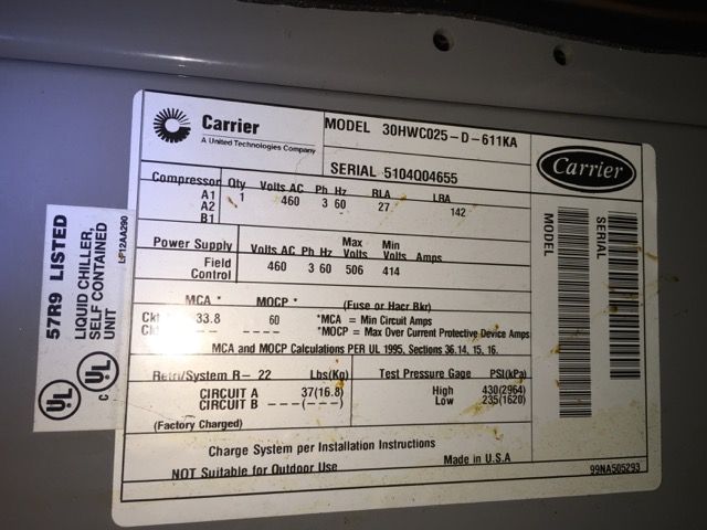 Carrier Liquid Chiller model 30HWC025-D-611KA, 460v, Indoor use only