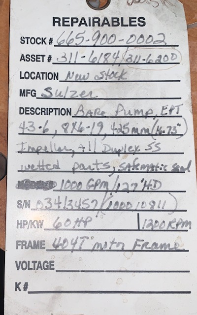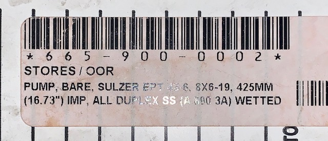 New Storeroom Spare Casing/Volute for Sulzer Pump model EPT43-6 A890 stainless