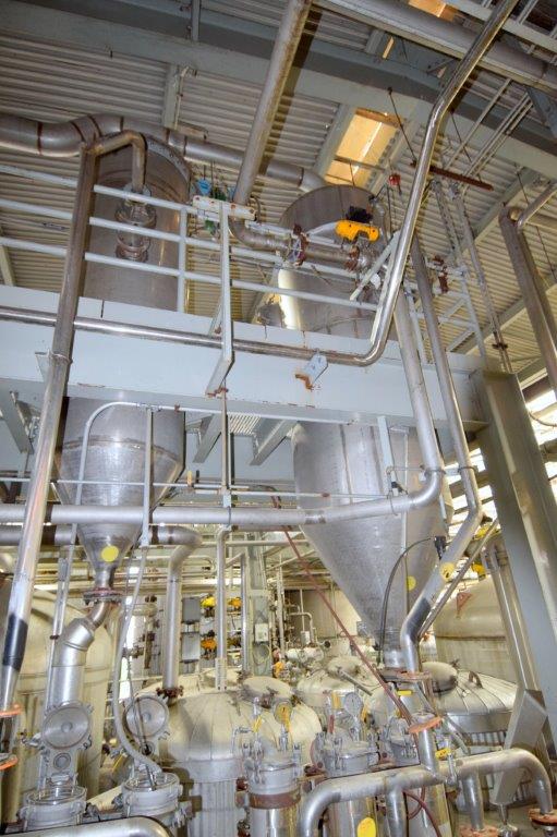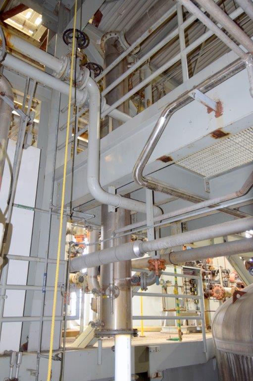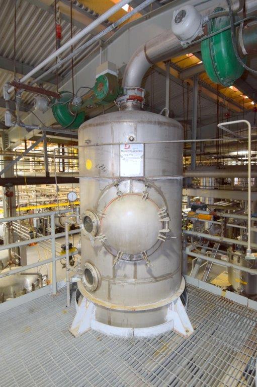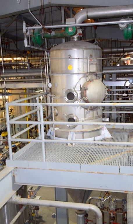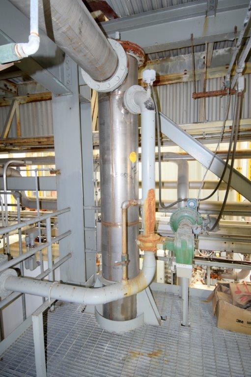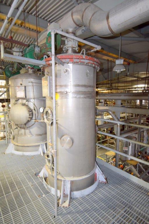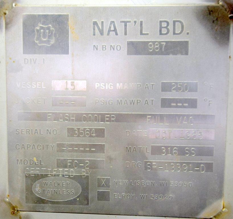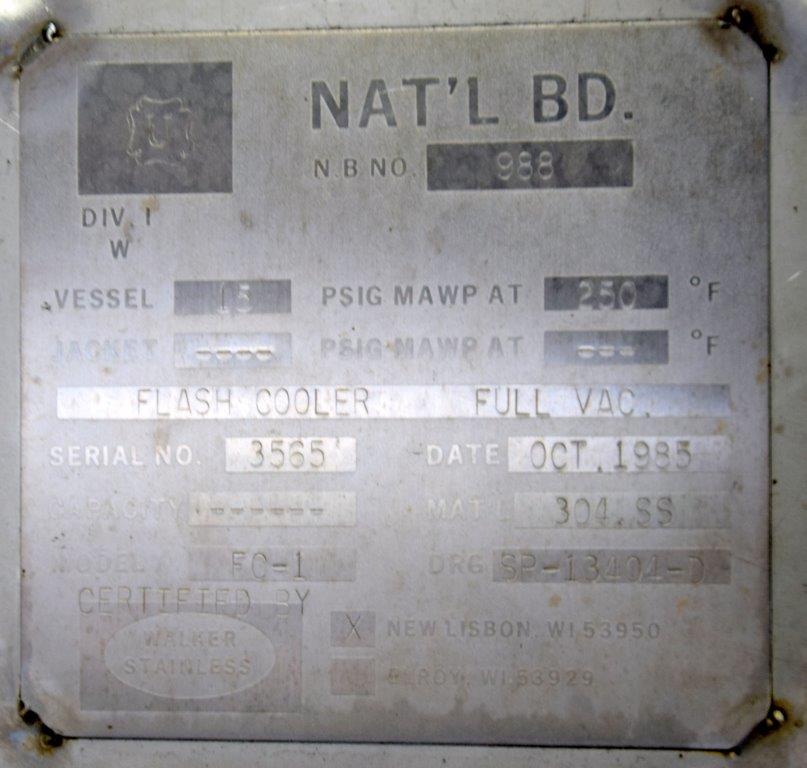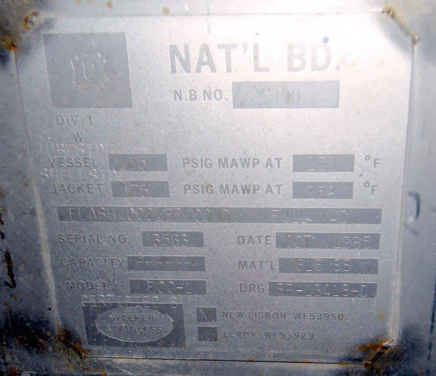 Used- Dedert Single Effect Evaporator, Consisting Of: (1) Vertical flash cooler, model FC-1, 304 stainless steel. Approximate 40″ diameter x 108″ tall, internal rated Full Vacuum/15 psi at 250 degrees F., side lug mounts, certified by Walker Stainless, National Board# 988, serial# 3565, built 1985, (1) Vertical flash cooler, model FC-2, 316 stainless steel. Approximate 36″ diameter x 108″ tall, internal rated Full Vacuum/15 psi at 250 degrees F., side lug mounts, certified by Walker Stainless, National Board# 987, serial# 3564, built 1985, (1) Vertical flash cooler condenser, model FCC-1, 316 stainless steel. Approximate 220 square feet. Approximate 16″ diameter x 180″ tall, tube side rated Full Vacuum/15 psi at 250 degrees F., shell side rated Full Vacuum/75 psi at 250 degrees F., side lug mounts, certified by Walker Stainless, National Board# 990, serial# 3563, built 1985.