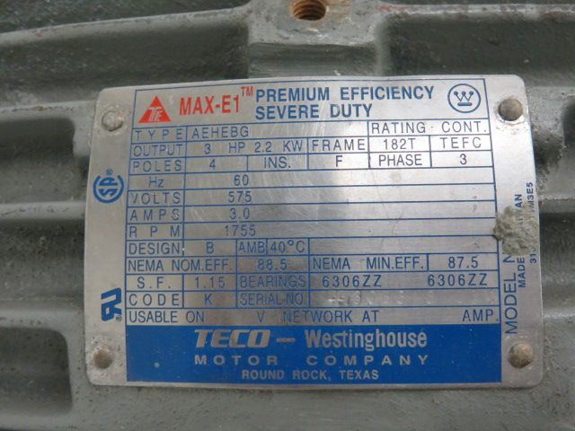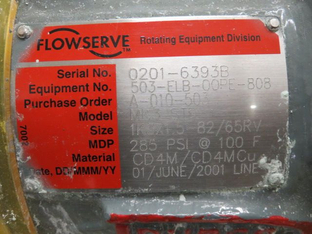 Durco pump size 3×1.5-82/65RV, material CD4M, used condition, 285 psi @ 100F, June 2001 with base and Teco 3hp, 575v, 1755rpm