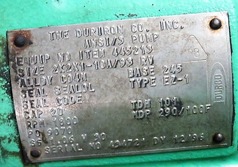 Durco Flowserve self priming pump size 2K2x1-10A/93RV, alloy CD4M, base 245, seal sealol, type EZ-1, capacity 20 gpm, 101 ft HD, 1800 rpm,