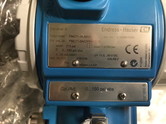 Unused Condition Endress Hauser 3″-150 calibration 0-150 psi abs pressure transmitter.