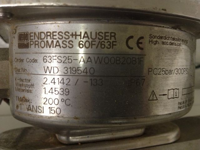 ENDRESS+HAUSER PROMASS 60F/63F, ORDER CODE 63FS25-AAWOOB20B1F, K FACTOR 2.4142/ -133, 1″, PC25bar/300 psi Flowmeter, used condition