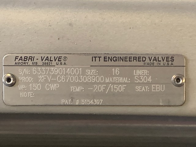 Fabri-Valve 16″-150 Knife Gate Valve with air operated cylinder; seat EBU, max temp 150F
