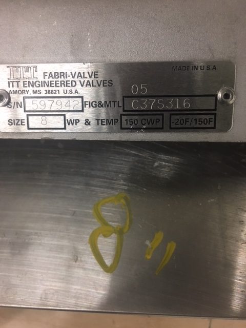 Fabri-Valve 8″-150 knifegate valve, with pneumatic actuator; material body, disc, seat: 316 stainless