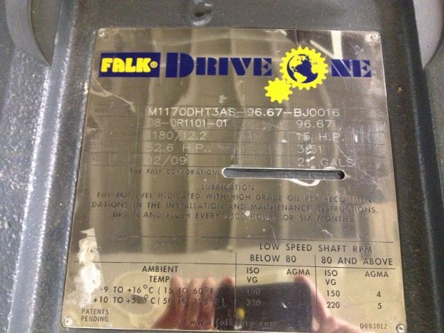 New Falk model M1170DHT3AS-96.67-BJ0016 Gear Reducer; ratio 96.67; 1180/12.2 rpm, date 02/09