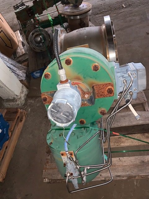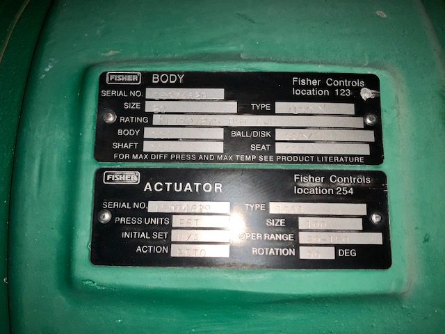 Fisher 20″ V150 Vee-Ball Control Valve; material CG8M stainless; Serial Number 15974629; Rating CL 150/ 275 psi; Body SST, Ball/Disc SST/PE; Shaft SST, Seat SST; Actuator type 1061 size 100, Action PDTO, Operation Range 20-150; with 4-20mA Positioner