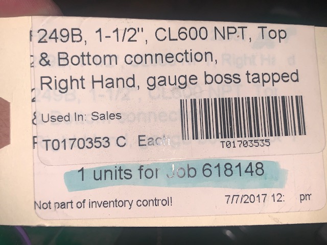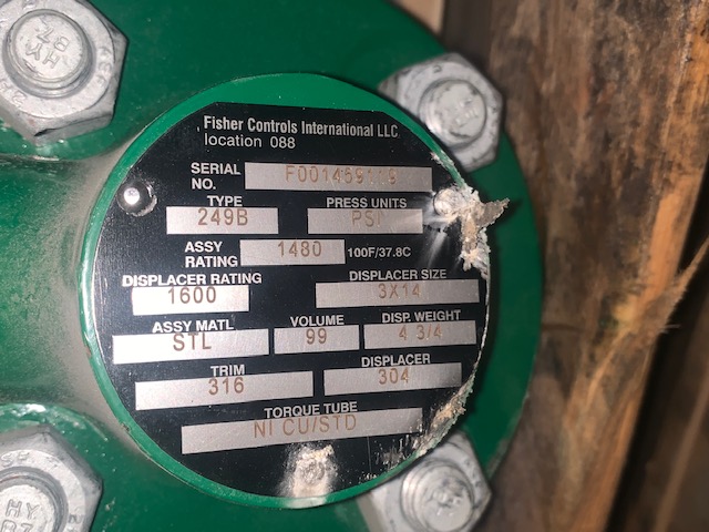 New Storeroom Spare Fisher Controls level-trol displacer controller type 249B class 600# size 1.5″; serial number F001459119