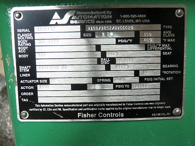 Fisher 3″ V150 V-Ball Control Valve with pneumatic actuator type 1052 size 33, material WCB/316