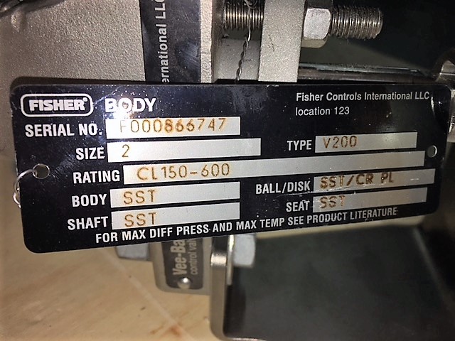Unused Condition Fisher V200 size 2″ class 150/600, material CG8M Stainless with Emerson Pneumatic Actuator