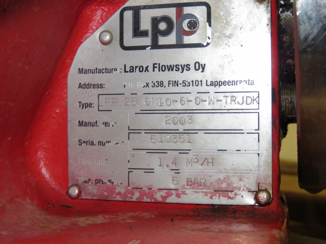 New surplus Flowrox Larox Flowsys Oy. Hose pump model PP25-GM10-6-0-W-TRJDK, year 2003, FLOW 1.4 M3/h, 5 BAR, with Baldor AC motor 1hp, 230/460v, 1750rpm, frame 143TC