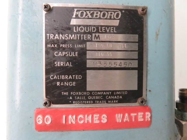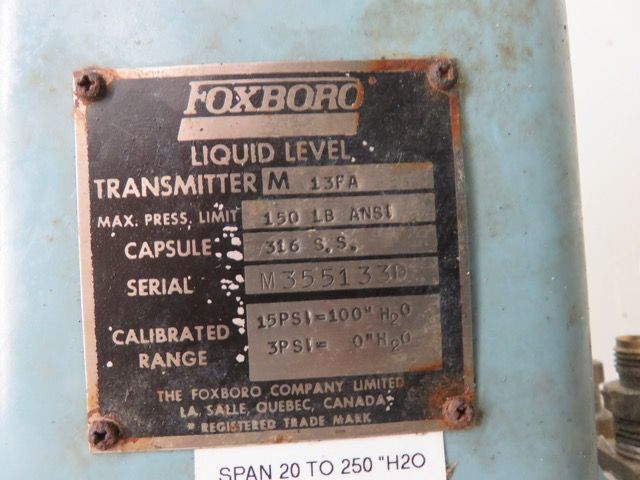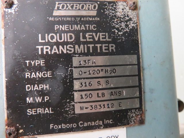 Foxboro Pneumatic Liquid Level Transmitter type 13FA, range 0-120 inches water, diaph material 316ss, mwp 150 ANSI, Made in Canada. (2 units available)