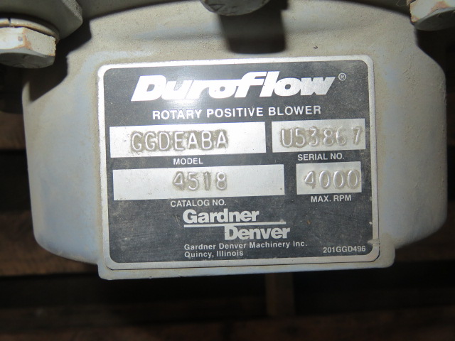Gardner Denver DuroFlow Rotary Positive Blower model GGDEABA, catalog number 4518, serial number U53867, Max Rpm 4000